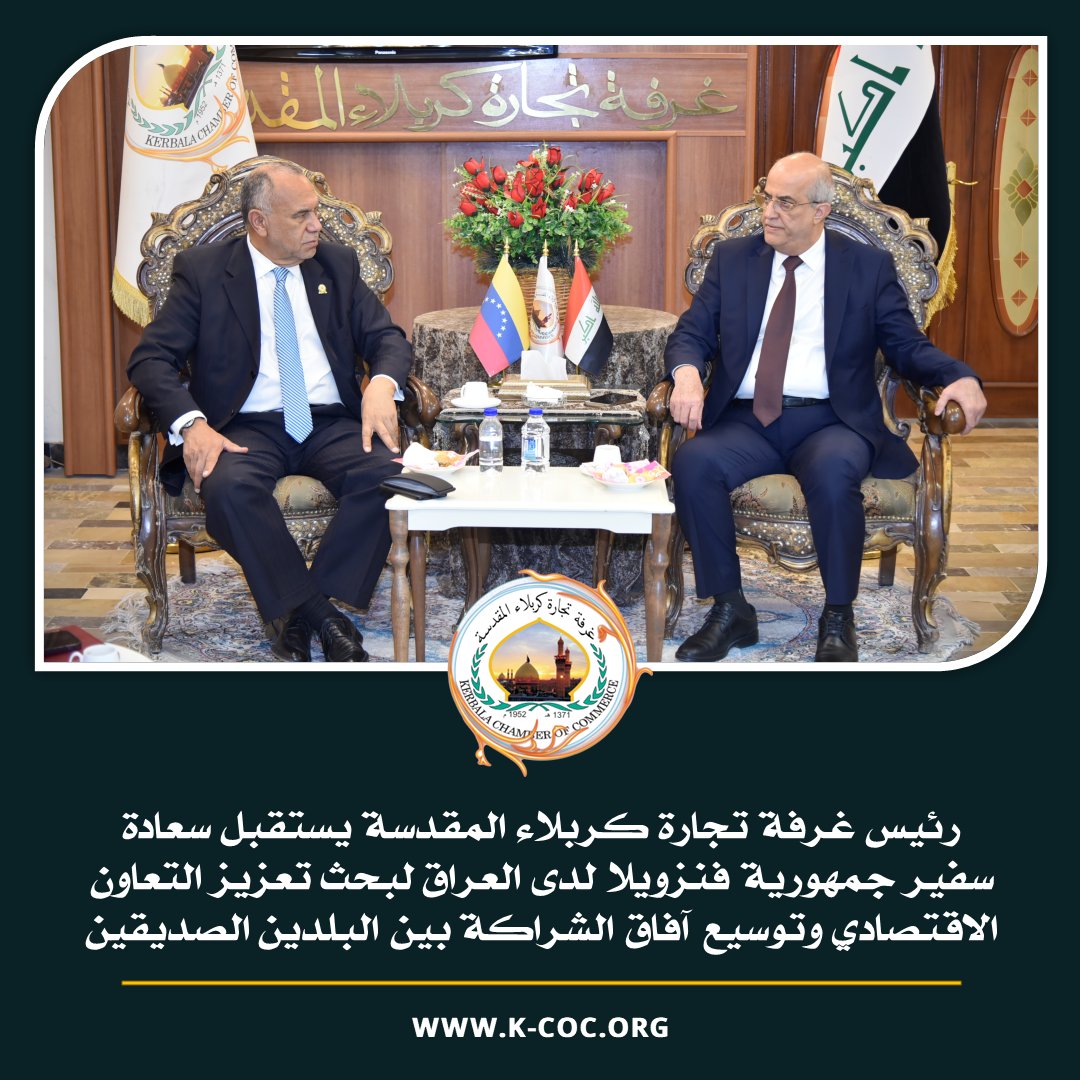 استقبل المهندس زمان صاحب عبد عوّاد رئيس غرفة تجارة كربلاء المقدسة والمهندس حسين الشريفي عضو مجلس ادارة الغرفة، سعادة سفير جمهورية فنزويلا البوليفارية في العراق السيد أرتورو جاليجوس، مساء هذا اليوم المصادف 22/10/2025 في مبنى الغرفة، في زيارة رسمية تهدف…